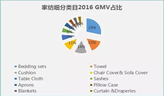而在2016家纺细分类目GMV占比中,床上用品套装仍然是家纺中的重中之重——GMV占比达到29%,这也是竞争最激烈的产品线。不过,目前排名靠前的都相对是标准化的家纺产品,比如占比15%的毛巾,占比14%的靠垫和占比11%的椅套等。