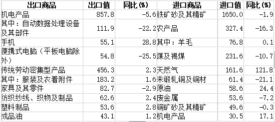 前三季度我国对澳大利亚主要进、出口商品总值表